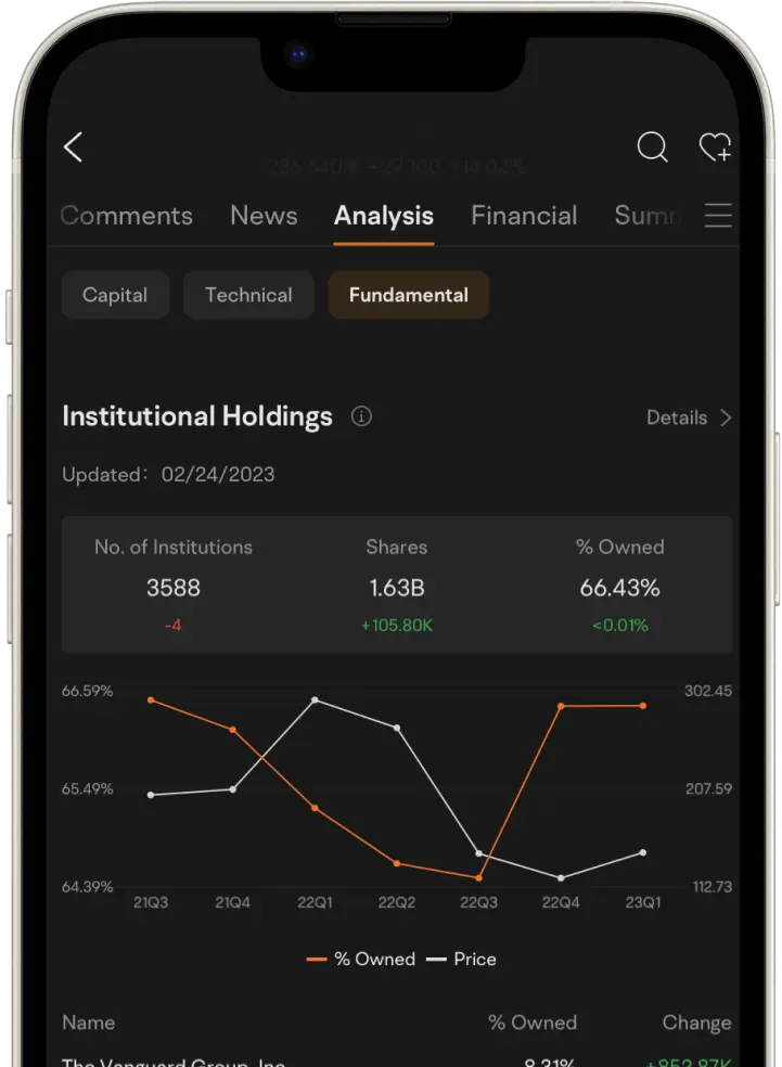• Easily analyze ownership activities with visualized and aggregated institutional holdings analysis.
